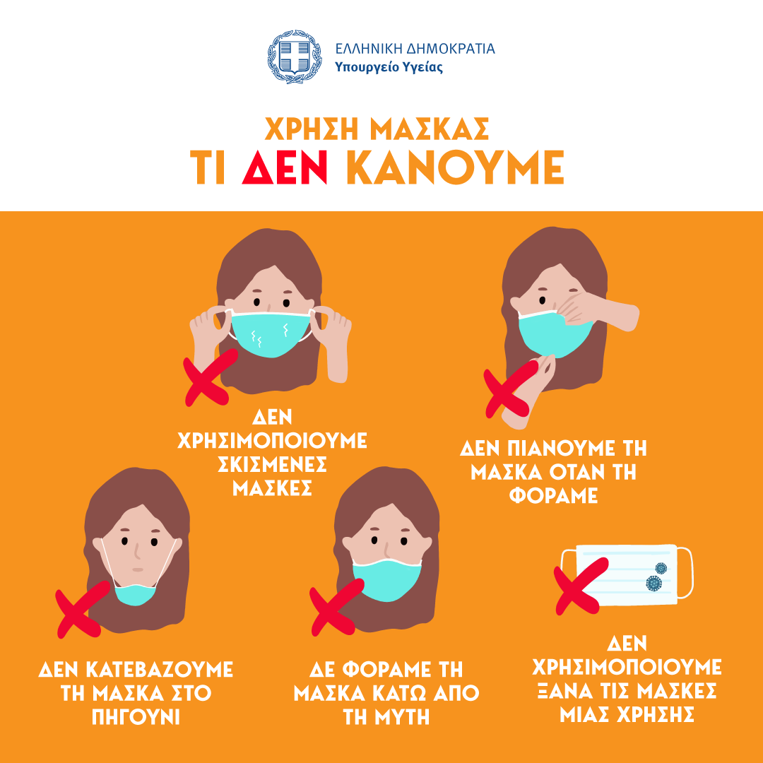 Επισημαίνεται ότι, η χρήση της μάσκας είναι ένα συμπληρωματικό μέτρο και δεν υποκαθιστά τους βασικούς κανόνες προστασίας όπως η φυσική απόσταση >1,5μ, η αναπνευστική υγιεινή (χρήση χαρτομάντηλου για τον βήχα ή φτέρνισμα), η υγιεινή των χεριών και η αποφυγή αγγίγματος του προσώπου.